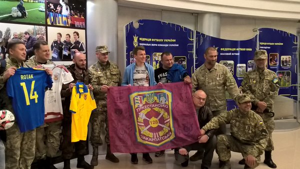 Бойцы АТО передали флаг своего подразделения игрокам сборной Украины