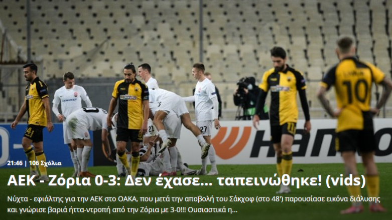 Греческие СМИ разгромили АЕК в пух и прах за поражение от "Зари" (0:3), не стесняясь использовать громкие заголовки и выражения: "унижение, чёрная ночь, бездарная игра, позор" – такие слова часто встречались в отчётах о матче. Греческие журналисты явно сильно расстроились из-за этого поражения, которое, по их мнению, лишило АЕК реальных шансов на выход из группы.