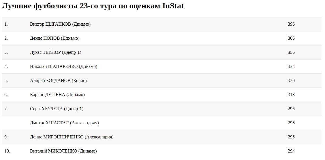 Самым полезным футболистом 23-го тура УПЛ по оценкам InStat стал полузащитник Динамо Виктор Цыганков, пишет zbirna.com. В чемпионском поединке с Ингульцом он показал эффективную игру — забил два мяча и отдал одну голевую передачу. Любопытно, что это лишь четвертое подобное признание представителя Динамо в текущем сезоне и первое для самого Цыганкова.
