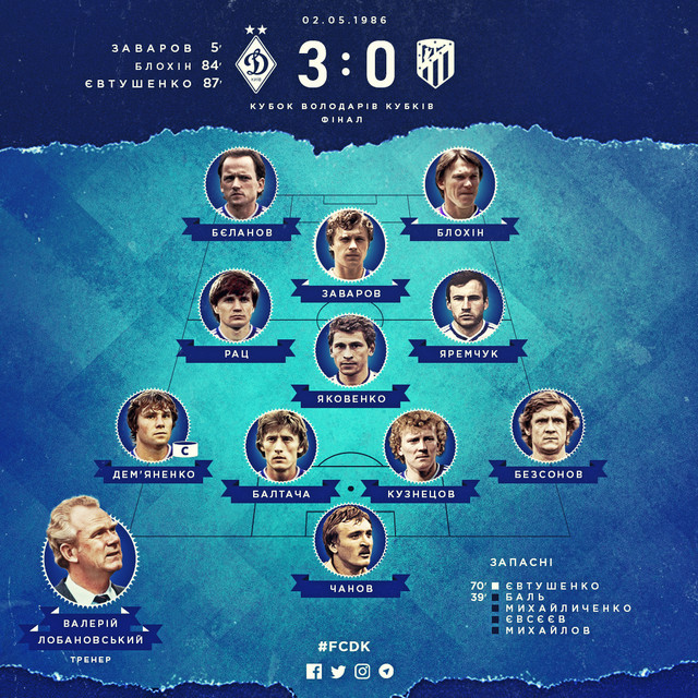 К слову, Блохин является единственным из всех динамовцев, который принимал участие в обоих победных для нашего клуба розыгрышах Кубка Кубков, вновь отыграв все девять матчей на пути к трофею. В 86-м кроме него всех девяти матчах турнира приняли участие еще шестеро – Беланов, Евтушенко, Демьяненко, Рац, Кузнецов и Яремчук, из них четверо последних провели все игры от первой и до последней минуты. Лучшими бомбардирами команды стали Блохин, Беланов и Заваров, которые отличились по пять раз. Матч с "Атлетико" Блохин провел с повязкой на ноге из-за повреждения задней поверхности бедра, полученного в сотом матче за сборную СССР.