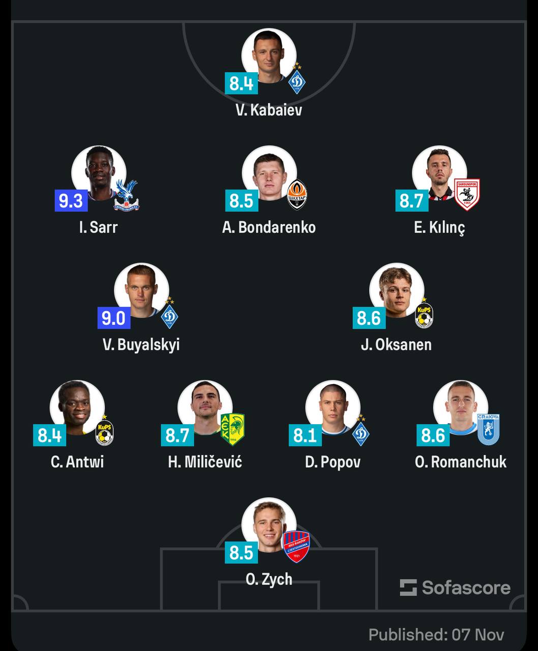 Три гравці "Динамо" та екс-динамівець Романчук потрапили до символічної збірної туру в Лізі конференцій від SofaScore