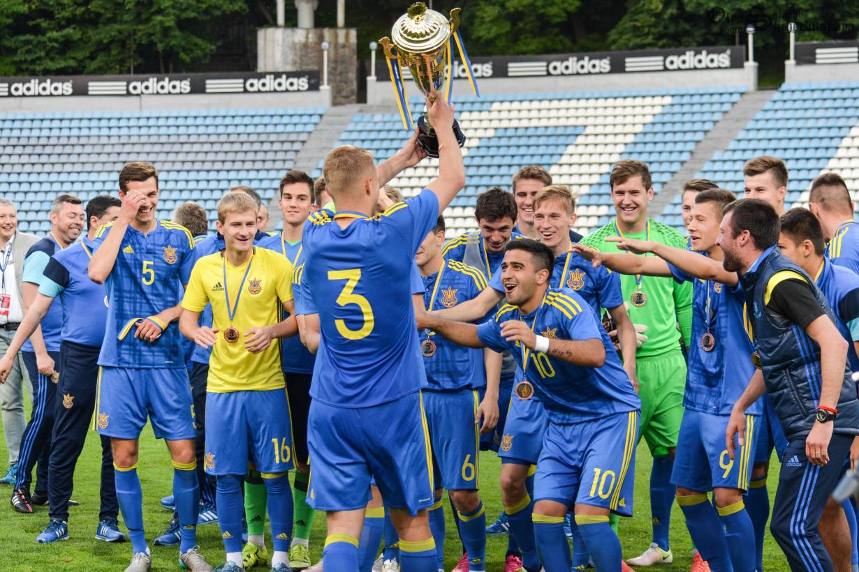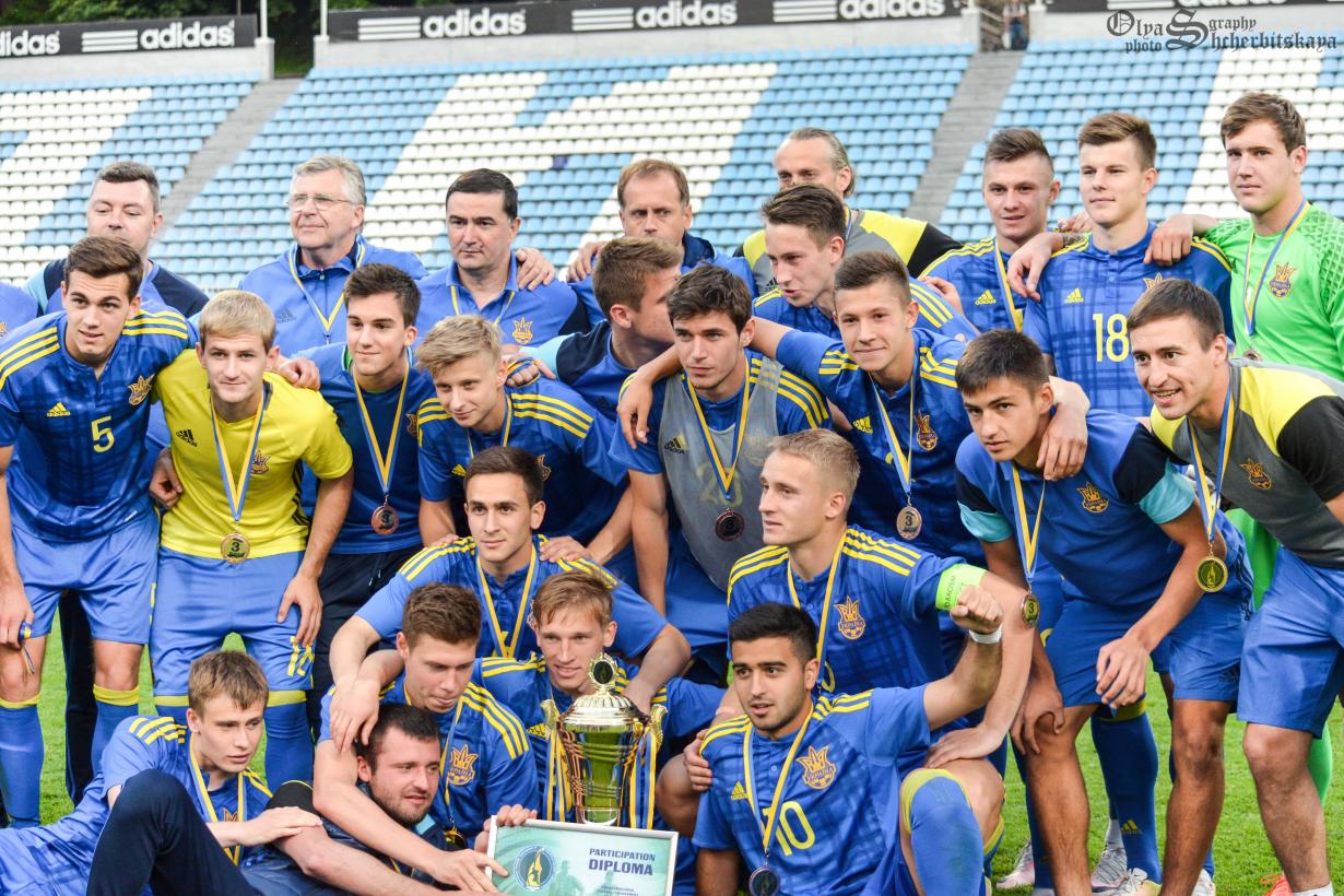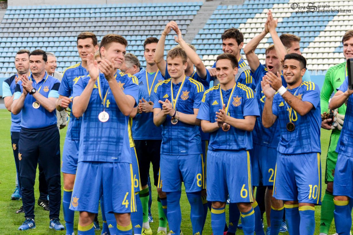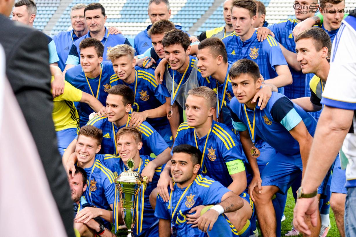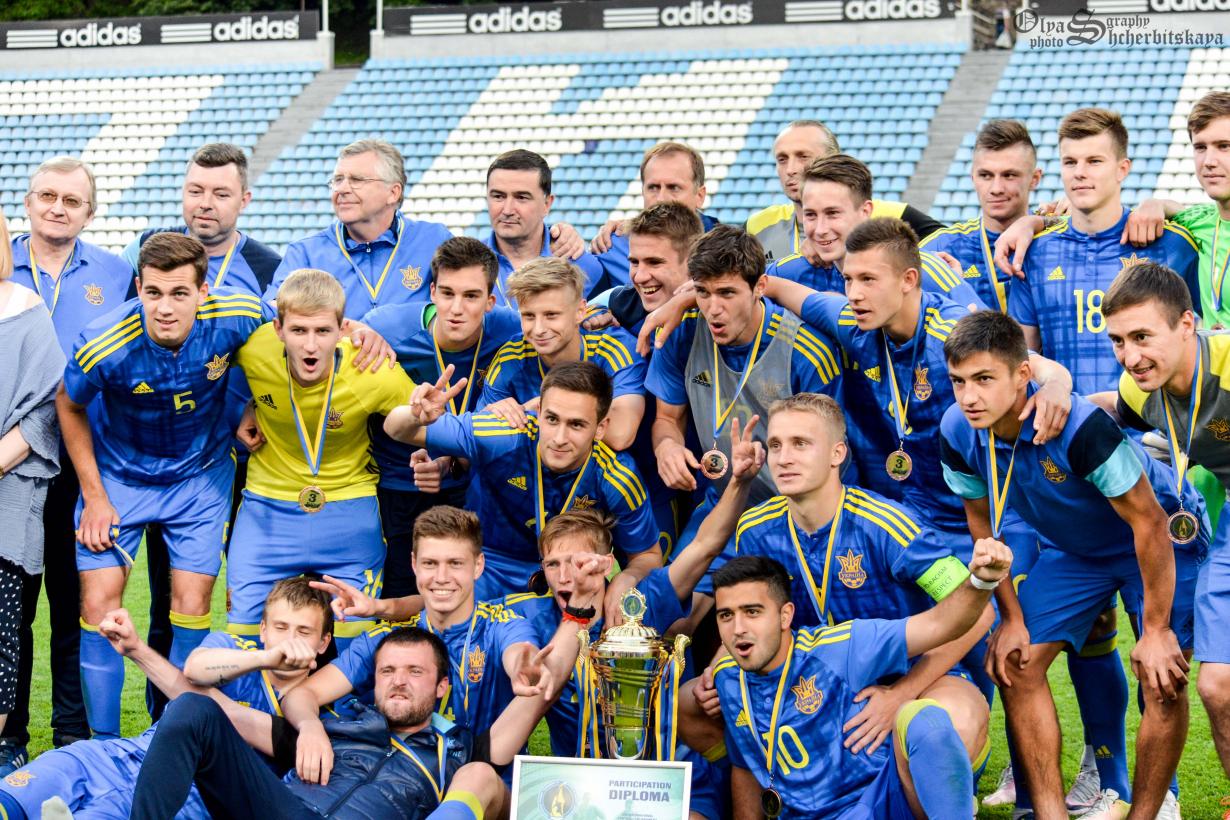 Молодежная сборая Украины празднует завоевание бронзовых медалей на момориале Лобановского
