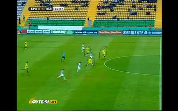 Игорь принимает внешне не очень логичное решение. Он секунду тянет мяч поперек поля. Но благодаря этому нехитрому маневру - а) три игрока "Оболони", возвращающиеся через центр поля на свою половину, концентрируются на хаве "Карпат" и на секунду выключаются их игры; б) Кузнецов своим рывком еще дальше утягивает центрбеков киевлян вглубь поля; в) между игроками "Оболони" возникает разрыв, в который влетает, набравший скорость Кополовец. Ну, а продолжение вы уже видели...