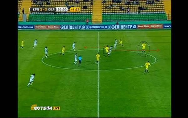 Игорь получает мяч возле центрального круга. Вроде бы, наиболее очевидный для него вариант продолжения игры - пас на правую бровку, куда побежал открываться Кузнецов (на стоп-кадре этого не видно). Но в таком случае, нападающий "Карпат" должен был столкнуться с одним, а то и с двумя центрбеками "Оболони", что в итоге могло привести к быстрой потере мяча либо к потере контратакой остроты.