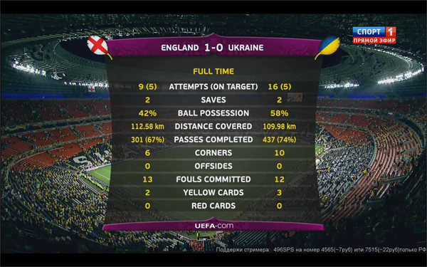 Парни молодцы бились,было довольно мало брака. В первые 10 минут я был ошеломлён прессингом нашей команды(как думаю и многие из вас),спешили забить с первой минуты ,в первом тайме особенно было заметно как открывались нападающие и это не только Девич с Милевским... Хоть и поломали всю игру Англам (а я уверен ,что они не ожидали от Украины такого ошеломляющего территориального преимущества) ,но положительного результата добиться не смогли,а результат является самым главным.