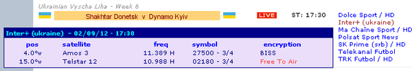 Виглядатиме це приблизно так, вибираєте вверху день матчу, знаходите в списку матч і наводити на нього, вам з'явиться список усіх доступникх трансляцій, покаже які канали закодовані та супутникові параметри ТК.