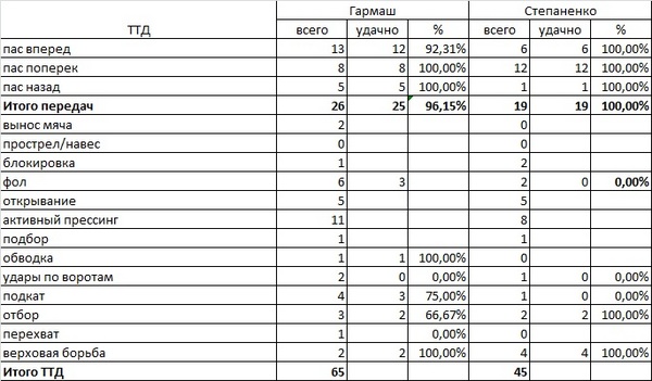 У Тараса это связано с тем, что он практически не принимал участия в атаках своей команды, что привело к невысокому количеству созидательных действий. Также и Динамо остро и много не атаковало, что привело к невысокому количеству и оборонительных действий. Но в противовес небольшому объему работ стоит сказать, что качество ТТД у Тараса было очень высоко.
