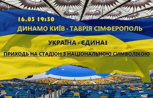 Уважаемые болельщики, друзья и граждане! Есть предложение в знак поддержки единства страны, прийти на стадион 16 марта на матч Динамо - Таврия с национальной украинской символикой. Сейчас не время делиться на болельщиков Динамо и Таврии, Шахтера и Днепра. Все мы должны быть болельщиками Украины и демонстрировать стремление к мирной жизни на своей единой и неделимой Великой Родине. До встречи на стадионе! Слава Україні!