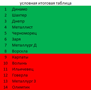 Для наглядности возьмем условную таблицу. Предположим, что по итогам 26 туров команды заняли такие места (повторю, места вымышленные для наглядности)