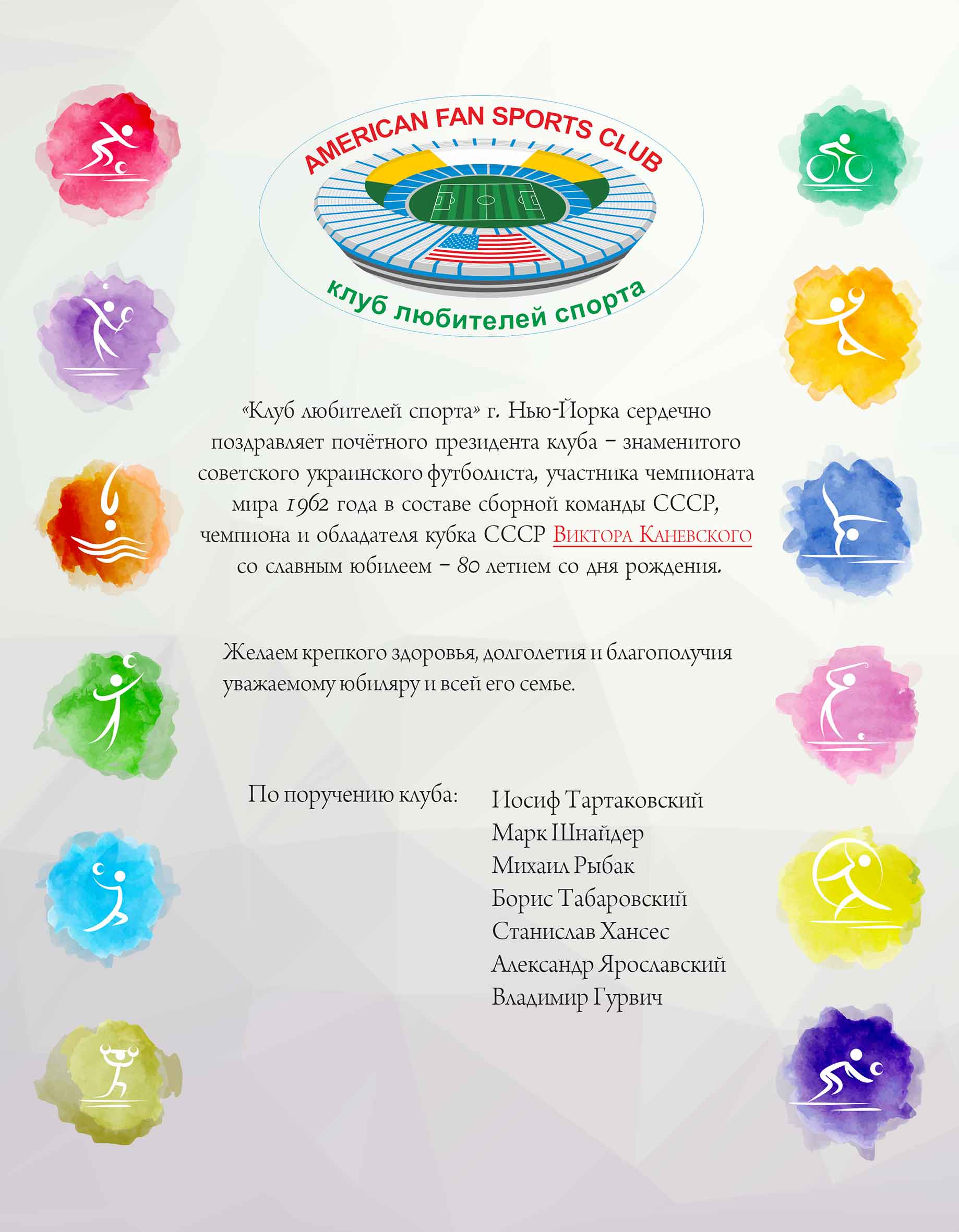 Наш спортивный Фан Клуб тепло поздравил Виктора Каневского со славной датой и направил ему этот памятный адрес: