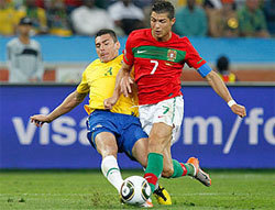 Хотя первый тайм матча был еще более-менее. Он вышел богатым на события, да и моменты у команд были. Португальцы, помня, очевидно, о погроме от пентакампеонов в ноябре 2008 года со счетом 2:6, выставили на эту игру весьма оборонительный состав, в котором было фактически пять номинальных защитников, два опорника, номинально атакующие хавы Дуда и Данни, который выполняли большой объем работы по всему полю и постоянно помогали обороне, и выдвинутый вперед Роналду. Бразилия же играла в целом по привычной схеме, разве что номинальных форварда было все-таки два.