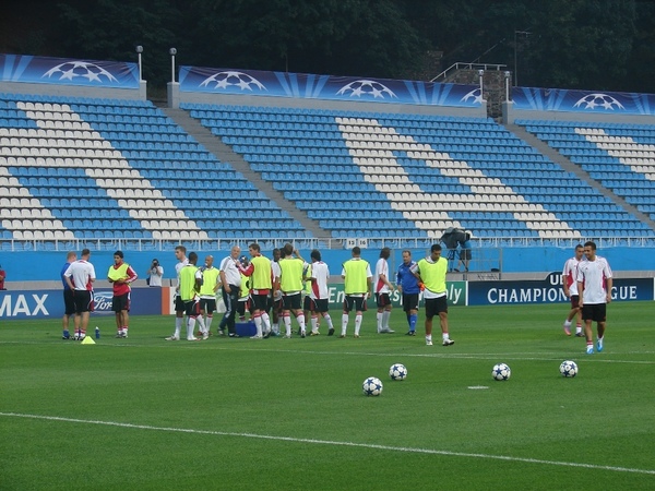 Примерно в 20.00 на газон стадиона "Динамо" ступили футболисты "Аякса", которые проводили тренировочное занятие почти за сутки до начала первого матча и стартового свистка швейцарского арбитра Массимо Бузакки.