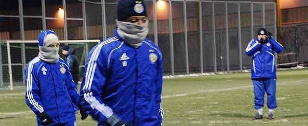 Кроме мороза футболистам досаждал еще и холодный ветер, поэтому по ходу тренировки некоторым пришлось утепляться (см. фото). Особенно холодно было бразильцам. Тем не менее, занятие происходило интенсивно, весело, с шутками-прибаутками.