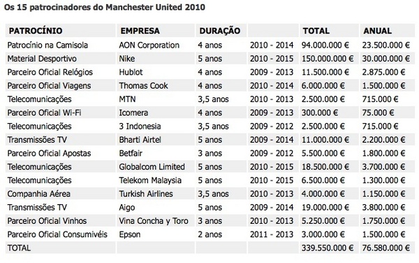 В число спонсоров «Манчестер Юнайтед» входят 15 компаний. Самый дорогой контракт у клуба с всемирно известным производителем спортивных товаров Nike, который ежегодно перечисляет «МЮ» по 30 миллионов евро, на втором месте – титульный спонсор AON (23,5 миллионов евро).