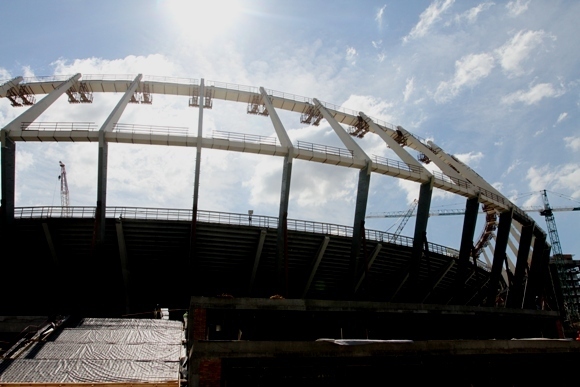 В частности, полностью выполнено остекление контура стадиона, все помещения внутри стадиона отапливаются и освещаются, что позволяет проводить отделочные и монтажные работы в зимний период без нарушения технологических процессов.