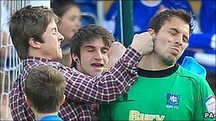 Во время матча второй английской лиги между «Бэри» и «Честерфилдом» на поле выбежали болельщики и окружили вратаря. Один из них ударил футболиста.