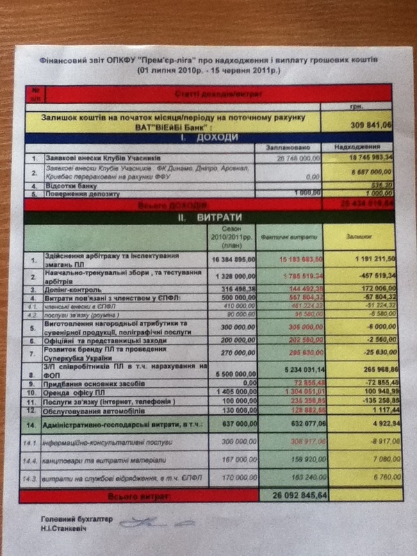16 июня президент "Арсенала" Вадим Рабинович покинул собрание представителей клубов Премьер-лиги и в кулуарах нещадно раскритиковал представленный ПЛ финансовый отчет. Его возмутило то, что статьи перерасхода не были согласованы с клубами. Вадим Зиновьевич был очень убедителен в своих словах, но лучше один раз увидеть, чем 100 раз услышать. Предлагаем Вашему вниманию финансовый отчет Премьер-лиги, красноречиво отражающий, насколько точно выполнялся бюджет организации.