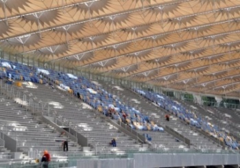 Также на главной арене будущего Евро-2012 продолжаются работы по монтажу мембранного покрытия крыши. Уже смонтировано 20 секторов мембраны, а еще 8 находятся в работе.