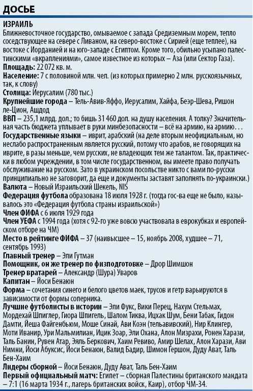 Так близко к ЧМ израильтяне подбирались лишь однажды, в 89-м. Тогда для путевки в Италию сборной Израиля, ведомой её лидером – Эли Оханой (по мнению многих, лучший израильский нападающий в истории; по крайней мере, Охана до сих пор удерживает первенство в списке бомбардиров сборной в отборочных матчах к ЧМ) не хватило совсем чуть-чуть: поражение от Колумбии в стыке – 0:1, 0:0. В 94-м Израиль приютили в УЕФА, и на ЧЕ «сине-белая» сборная могла пробиться уже со второго раза, под руководством Шломо Шарфа. Если помните, тогда, осенью 99-го, параллельно нашим мучениям со словенцами, израильтяне в золу и пепел сгорели датчанам – 0:5 в Рамат-Гане и 0:3 в Копенгагене. Вот где пригодилась архивная подшивочка тогда еще еженедельника «Футбол»! Спецкор издания по всему свету Патрик О'Рангутан (мой хороший друг, кстати сказать – бывало, что и на «сионистскую» землю Патрика заносило; в последнее время визитами не балует – кризис виноват, наверное, а может, просто пить бросил – всё равно ведь не признается) тогда написал, что единственный момент у сборной Земли Обетованной за все 180 минут противостояния возник во второй половине ответного матча. А уже после игры в израильской федерации разгорелся скандальчик – мол, игроки сборной Израиля за сутки до матча заказали себе в номер девочек (не иначе чтобы отомстить хотя бы датчанкам за домашние 0:5!!). За доказательства «злочина» сочли публикации датской бульварной прессы. «А были ли девочки», выяснять никто не стал (главный тренер Шарф вообще уверял, что работники отеля приняли за развратниц родственниц и подруг футболистов!), но это был до сих пор последний «плей-офф» Израиля за выход в финальную часть крупного форума.