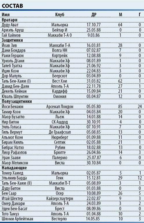 По составу сборной Израиля можно изучать футбольную географию Европы. Здесь представители высших лиг Италии, Англии, Испании, Германии, России, Франции, Голландии, Бельгии, Шотландии, Польши, Кипра, Уэльса... Интересно, они там точно «просто играют в футбол» или МОССАД «европейское направление» осваивает?! Причем из 36-ти приведенных кандидатов (поверьте, и это не предел!) пригласить могут кого угодно, то есть возможный состав сборной, даже в расширенном варианте, предсказать невероятно трудно! Единственное исключение – вратарская позиция: Дуду Авату, имеющему за плечами более двух с половиной сотен матчей в испанской Примере, конкуренцию составить сложно.