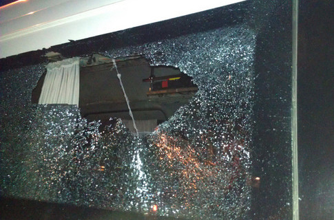 Следующим в колонне следовал автобус Volkswagen. Он пострадал еще серьезнее. Как ни пытался водитель «увернуть» в сторону, один булыжник внушительного размера попал в окно и разбил его вдребезги. Есть пострадавшие.