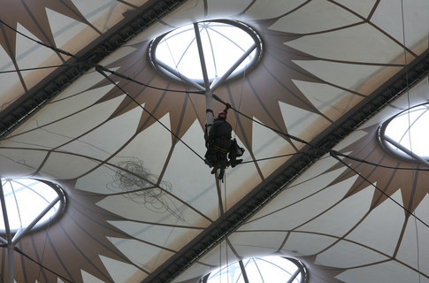 Пока футболисты киевского "Динамо" тренировались, свою подготовку к очередному матчу проводил и НСК "Олимпийский". Под одним из виражей трибун тройка рабочих на специальных подъемниках поднялась под самую крышу, как акробаты под купол цирка, где принялась возиться с пропускающими солнце зонтами. В другой стороне рабочие прохаживали по самой крыше. А противоположные центру трибуны мыли специальными мойками, из-за чего вода изрядно залила беговые дорожки.