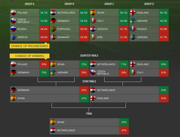 Теперь Castrol Edge Calculator предсказал события ЕВРО-2012 и определил, какие команды имеют наибольшие шансы на победу. Моделируя ход турнира более 100,000 раз, он спрогнозировал результаты команд в группах и в турнире в целом.