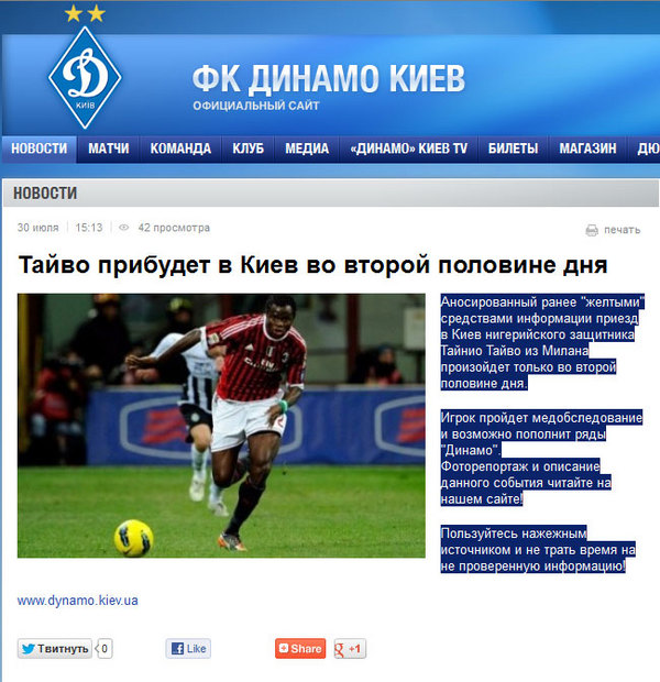 "Аносированный ранее "желтыми" средствами информации приезд в Киев нигерийского защитника Тайнио Тайво из Милана произойдет только во второй половине дня.