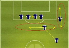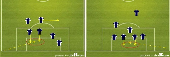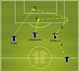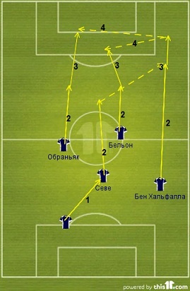 Здесь и далее перемещения игроков обозначены прямой линией, передачи - пунктиром