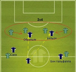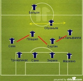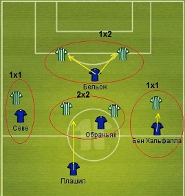 Переходя на персоналии, следует отметить Сане. Людовик иногда может совершить нелогичный поступок – оставить свою зону без присмотра, скажем, пойдя на розыгрыш аута соперником. Севе и Бен Хальфалла могут выключиться из борьбы после того как их обыграют в центральной линии. Или же наоборот - сместиться на одну линию к защитникам, расширив линию обороны, но оставив много пространства для подключения крайних защитников соперника.