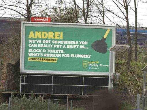 "Андрей, мы узнали, что ты мог бы подработать...чисткой туалетов в блоке D. Как будет по-русски "вантуз"?" - гласит текст на рекламном щите.