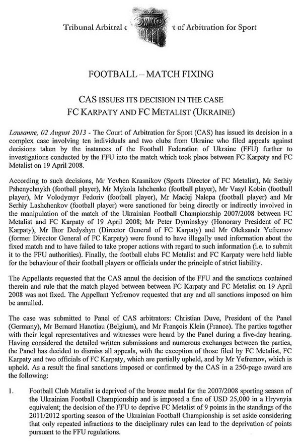 Сьогодні, 2 серпня 2013 року ФК «Карпати» (Львів) отримав рішення Спортивного арбітражного суду (Лозанна, Швейцарія).