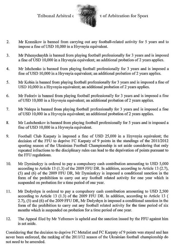• на футболістів Пшеничних, Іщенка, Кобіна, Федоріва, Налєпу накладено заборону професійно займатися футболом протягом 3 років з додатковим випробувальним періодом на 2 роки, а також штрафні санкції у розмірі по 10 000 доларів США; на футболіста Сергія Лащенкова накладено заборону професійно займатися футболом протягом 5 років та штрафні санкції у розмірі 10 000 доларів США;