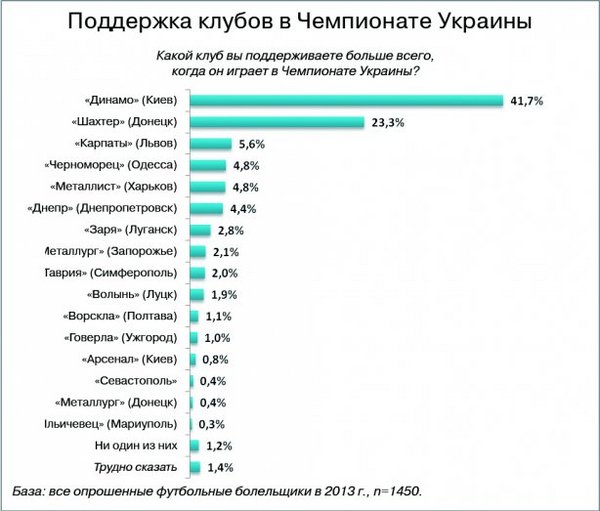 Согласно исследованиям КМИС, самой большой поддержкой болельщиков пользуется киевское "Динамо". 41,7% переживают за него в матчах украинской премьер-лиги (УПЛ), 44,7% — в еврокубковых играх. За ним следует "Шахтер" — 23,3 и 28,7%, соответственно. Любопытно другое: уровень поддержки "бело-синих" за два года существенно не изменился (40,4% — в 2011-м, 41,5% — в 2012-м). А вот у "горняков" тенденция иная. В 2011-м за них болели 30,4% в поединках УПЛ и 36% — в состязаниях евротурниров. В 2012-м — 26,8 и 30,4%. Актуальные показатели — смотри выше. Армия болельщиков "шахты" похудела почти на 7% в матчах УПЛ и примерно на столько же — в соревнованиях под эгидой УЕФА.