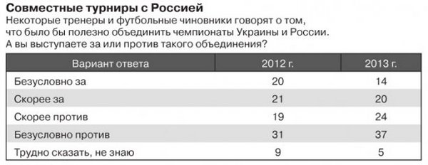 Отношение украинских болельщиков позволяет определить опрос КМИС. "Безусловно, за" высказались 14% (количество сторонников по результатам аналогичного исследования того же социологического центра год назад — 20%). "Скорее, за" — 20% (год назад — 20%). "Скорее, против" — 24% (год назад — 19%). "Безусловно, против" — 37% (год назад — 31%). Количество тех, кто не определился со своим отношением к проблеме, уменьшилось с 9 до 5%. Вывод — число сторонников "укропа" имеет ощутимую тенденцию к снижению. И, судя по всему, будет снижаться и далее.