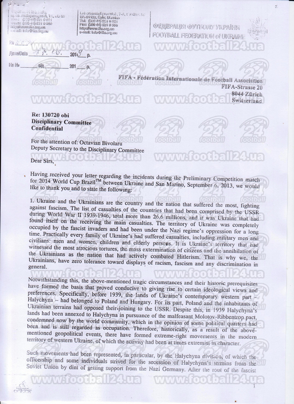 Мы получили ваше письмо, в котором говорилось об инцидентах во время отборочного матча к Чемпионату мира 2014 в Бразилии между Украиной и Сан-Марино, который состоялся 6 сентября 2013. Благодарим вас и хотим отметить следующее: