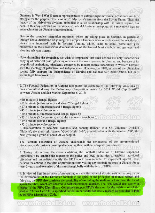 "С учетом возможности предотвращения любых проявлений дискриминации, которые могут нанести ущерб развитию всему украинскому футболу в духе соблюдения принципов взаимоуважения и fair-play, ФФУ также рассматривает возможность исключения стадиона из перечня спортивных сооружений, на которых разрешено проведение международных матчей. ФФУ также с пониманием отнесется к тому, что Дисциплинарный комитет FIFA поддержит решение ФФУ о дисквалификации стадиона "Арена Львов" на определенный срок, в частности, из соображений безопасности, как это предусмотрено ч. 3 ст. 66 Дисциплинарного кодекса FIFA".