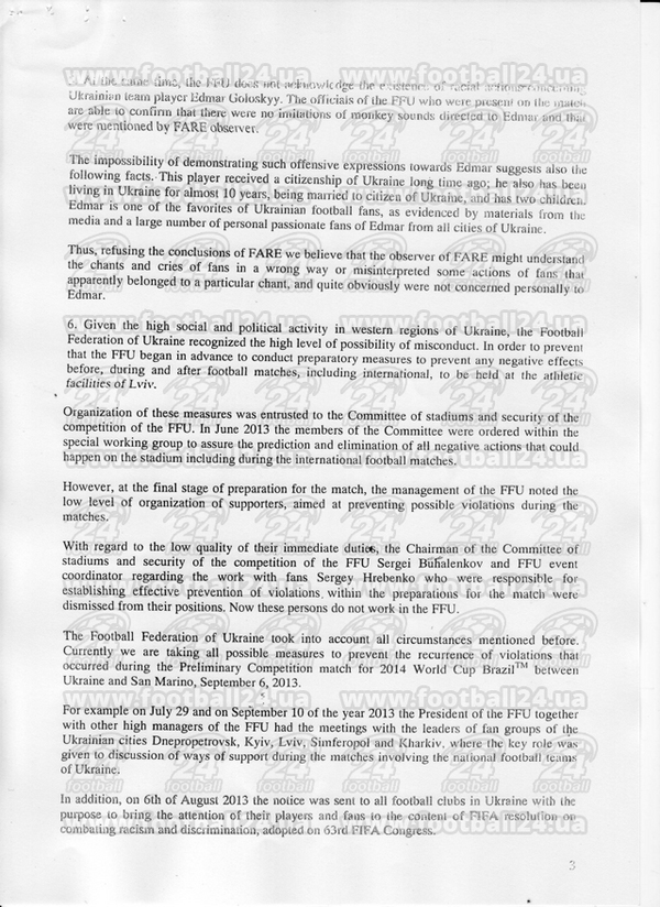 Вместе с тем, ФФУ не признает факт расистских действий в сторону игрока сборной Украины Эдмара. Присутствующие в тот день на матче представители ФФУ могут подтвердить, что в адрес Эдмара не звучало никаких имитаций обезьяньих криков, о которых упоминал наблюдатель FARE.