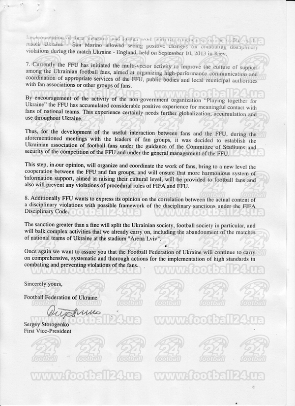Федерация футбола Украины учла все вышеуказанные обстоятельства. Сейчас мы принимаем все необходимые меры, чтобы предотвратить повторение нарушений, имевших место во время отборочного матча к Чемпионату мира 2014 в Бразилии между Украиной и Сан-Марино 6 сентября 2013 года.