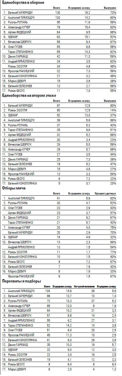 На флангах обороны с первой же игры появилась кадровая стабильность. Возможно, Вячеславу Шевчуку и Артему Федецкому где-то и не хватало кинжальных проходов и нацеленных передач в активную зону, но свои бровки они закрывали исправно. А если кто и получал травму или отбывал дисквалификацию, то на помощь приходил универсальный Олег Гусев.
