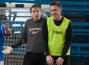 "У кого самая сильная команда?" - интересуюсь у Руслана Костышина. На что экс-игрок ЦСКА, "Днепра" и "Кривбасса" разводит плечами. Когда он выходит на поле, в зале появляется Юрий Максимов и сразу комментирует действия своего бывшего подопечного: "Рано закончил". Тему подхватывает Ульяницкий: "Ему бутсы не нужны, он поехал в Днепродзержинск на оловянный завод, там ему по всей стопе сделали. А то он так рвет, что бутсы рвутся". Максимов с лавки вновь шутит: "Дима, ты у меня уже на карандаше. Слежу за тобой, скоро фломастер достану".