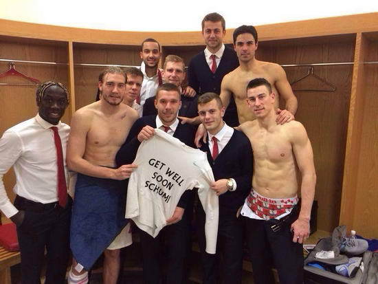 После трудной победы над "Кардиффом" группа "канониров" с Подольски во главе снялась в раздевалке со специальной футболкой, на которой написано "Поскорее выздоравливай, Шуми!". Опубликовав это фото в Facebook, Подольски приписал: "Тяжелая игра, важная победа - и мы опять на первом месте. Но наши мысли с тобой, Михаэль. Наилучшие пожелания небе от команды "Арсенал"! Польди".