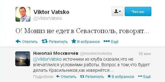 "О! Мониз не едет в Севастополь, говорят..." - написал известный комментатор и ведущий конференции на MatchDay.com.ua Виктор Вацко в своем твиттере.