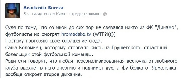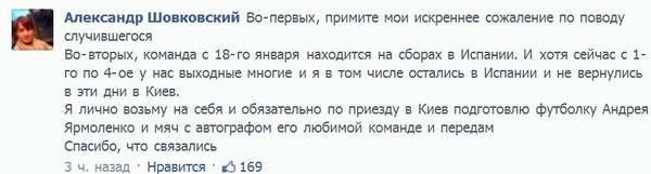 Спасибо, Шовковский. Как приятно что такой человек капитан любимой команды. Но почему же самому Ярмоленку не приехать с футболкой да и вместе с Сашей Шовковским и поддержать героя страны Коломийца... простого парня который вышел против власти на акции протеста... респект. Лучше быть без части руки, но человеком,у которого в сердце любов к стране чем презервативом с руками которые голосовали и сегодня хотят голосовать за Яныка и всю его банду. Слава Коломийцу Слава Украине Кстати... родственники Коломийца. Видел счет на Фейсбуке, хотел деньги отправить, но не приняло по тому номеру карты. Поэтому просьба напишите на емейл Украинской правды или тут на сайте, думаю Сидаш не будет против, что бы отправить деньги на карточку.