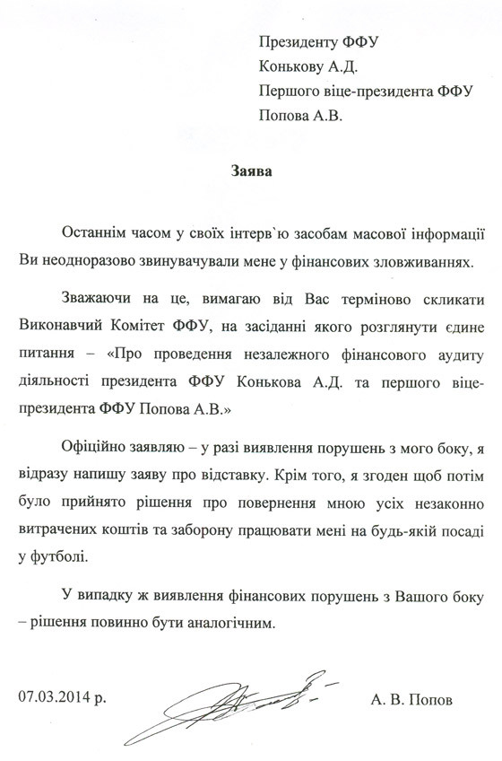 Первый вице-президент Федерации футбола Украины Анатолий Попов написал заявление на имя главы ФФУ Анатолия Конькова. Функционер выступил с предложением инициировать аудит своей финансовой деятельности за время работы в Федерации.