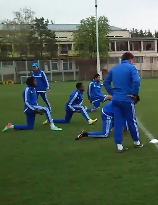 У футболистов хорошее настроение, они шутят и смеются. После пробежки украинцы и легионеры отдельно играют в квадрат. Вукоевич просит журналистов немного отойти, чтобы не получить мячом. Ребров к некоторым игрокам обращается на английском и сам раздает манишки.