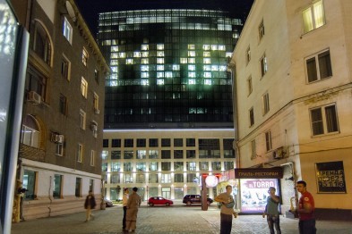Вчера, 23 мая, около 22 часов на огромной стене офисного здания СКМ в центре "Пушкинский" появилась надпись "МИР".