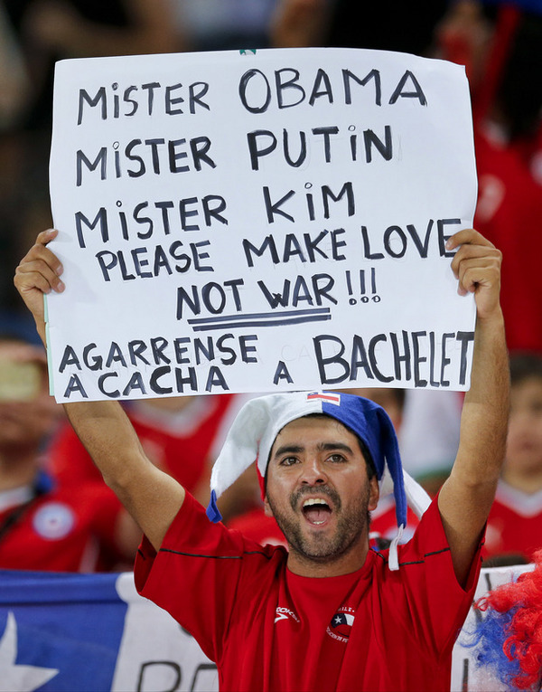 "Мистер Обама, мистер Путин, мистер Ким, пожалуйста, занимайтесь любовью, а не войной", - написал чилиец на своем плакате.