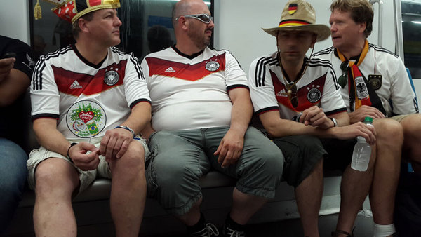 В метро ехал вот с такими колоритными немцами. Сегодня их в Рио намного больше, чем французов, но не факт, что последние в итоге проиграют в суппорте.