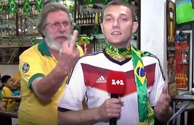 Журналист делал сюжет для канала "1+1" после матча 1/2 финала Бразилия - Германия (1:7). Фаны перепутали его с немецким журналистом, потому что он надел футболку сборной Германии.